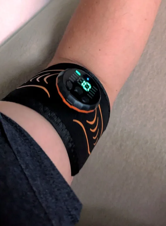It works perfectly, the vibrations are quite strong even at low intensities. It fits perfectly on the arms and even the calves.